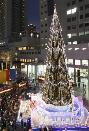 大阪市北区の複合商業施設「新梅田シティ」の広場に20日、高さ約27メートルの巨大クリスマスツリーが登場し、点灯式が行われた。